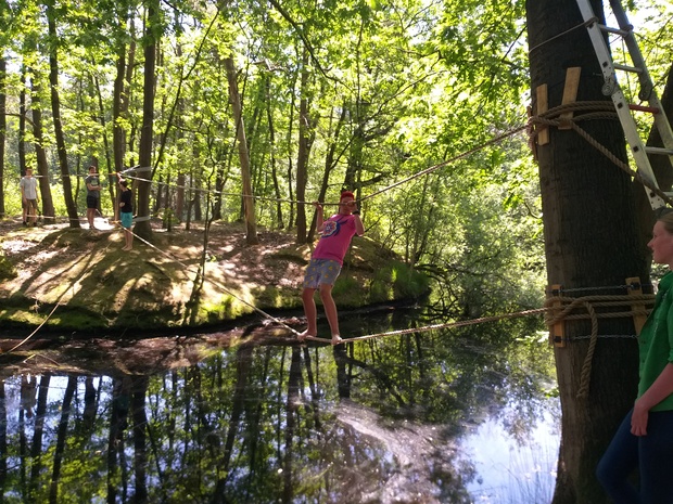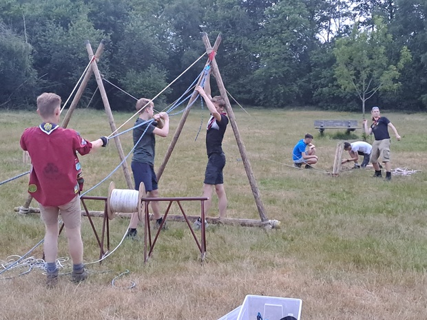 Hierna wordt de groep weer in tweeën gesplitst. De helft die voor de lunch knopen & steken, en sjorringen leerde, gaat naar de tokkelbaan, en de andere helft gaat dus knopen, enz. leren.