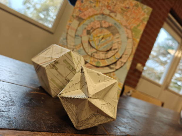 Je bedenkt en maakt daarna een nieuwe puzzel. Daarbij bieden we bouwplaten van geometrische veelvlakken die je in elkaar kunt zetten. Hiernaast hebben we oude topografische kaarten van bijna heel Nederland, die je kunt “verwerken” in jouw creatie…